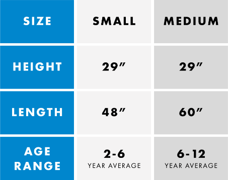 The large (60 x 29 x 20 inches) is best for kids between ages 6-12 and should be 100 lbs or less.