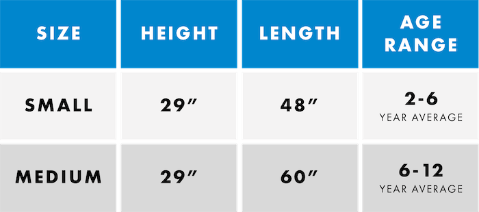 We've found the small (48 x 29 x 20 inches) to be best for those between the ages of 2-6 and recommend a weight maximum of 50 lbs.
